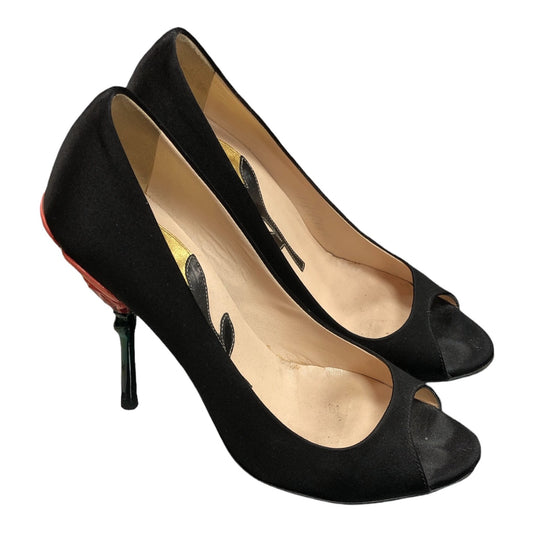 PRADA Fairy Collection Black Satin Peep Toe Sculpted Flower Heel